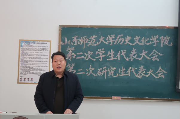最后,学生工作处办公室主任、学院团委书记魏宁代表共青团山东师范大学历史文化学院委员会对新一届学生会和研究生委员会成员的当选表示热烈祝贺,同时对与会成员未来学院工作,提出了两点要求:一是明确自身定位,在工作中积极主动,在学习中努力奋进;二是加强作风建设,杜绝官僚主义,“俯下身子”服务师生,及时反思工作中的不足,清晰明了地为学院工作指明了方向。最后预祝新一届学生委员会和研究生委员会工作开展顺利。