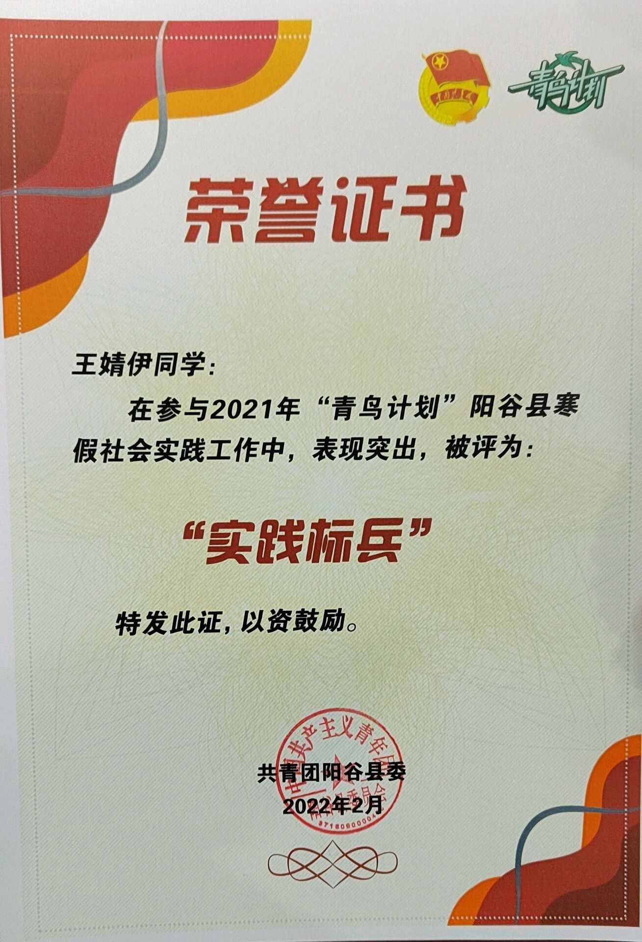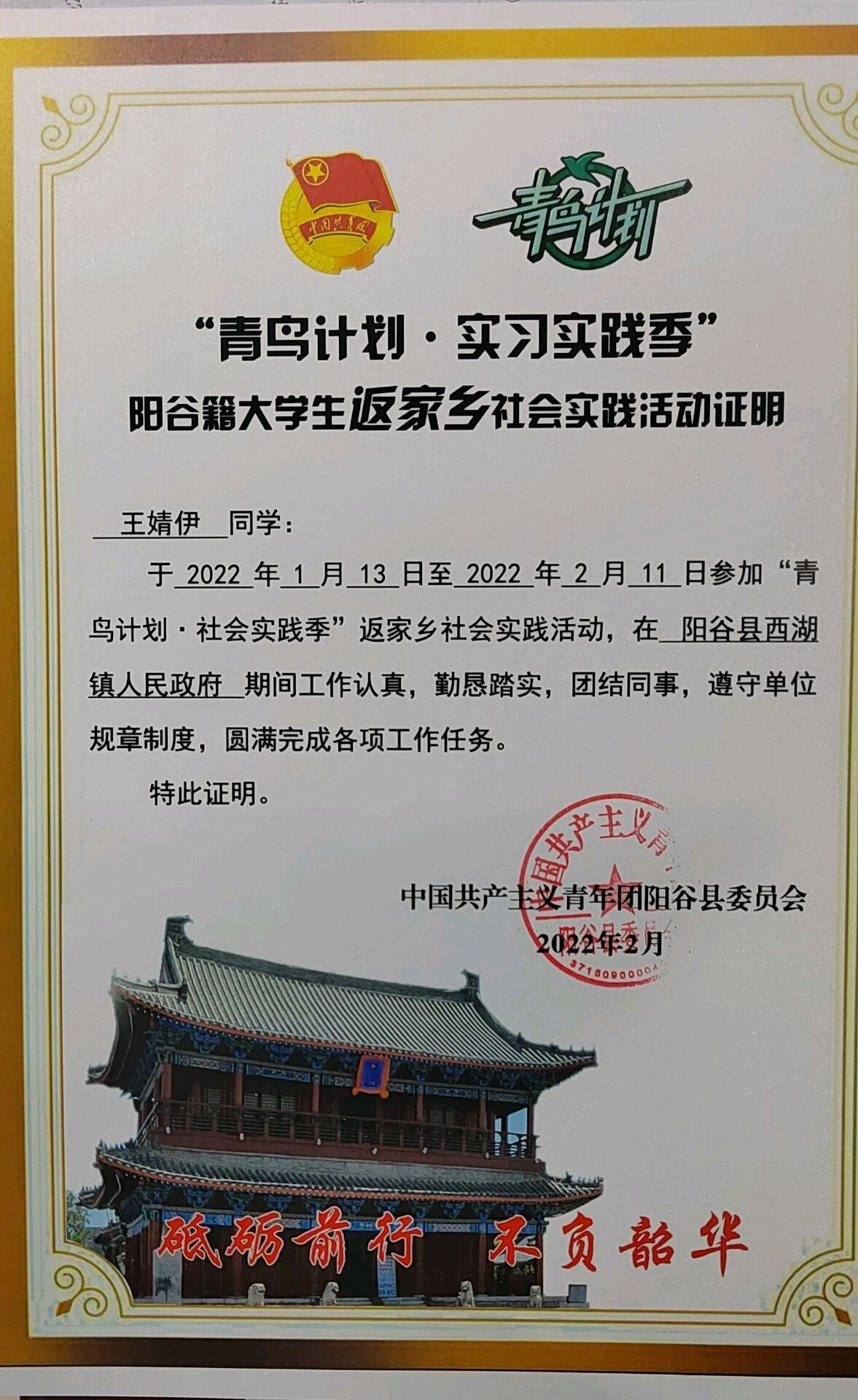 在工作过程中,他们以朝气蓬勃的姿态,走在基层工作的第一线。其中,2020级路桐轩在聊城市教育和体育局办公室实习,他坦言,这次实习经历使他受益颇多,同时也对他思考未来职业选择具有特殊意义;2020级彭怡平在家乡烟台莱州定海路社区开展了为期一月的实践活动,从事社区计生、疫情防控等有关工作,这次经历令她受益匪浅;2020级王玉硕同学圆满完成了“返家乡”暨“2022寒假公益实习活动”,表现优异获得了一致好评;2021级王婧伊则报名了阳谷县的政府辅助岗,被分配到镇政府,主要负责回乡人员的疫情防控工作。她认为参加"青鸟计划"不仅提高了自身素质,还强化了她的实践与组织能力。