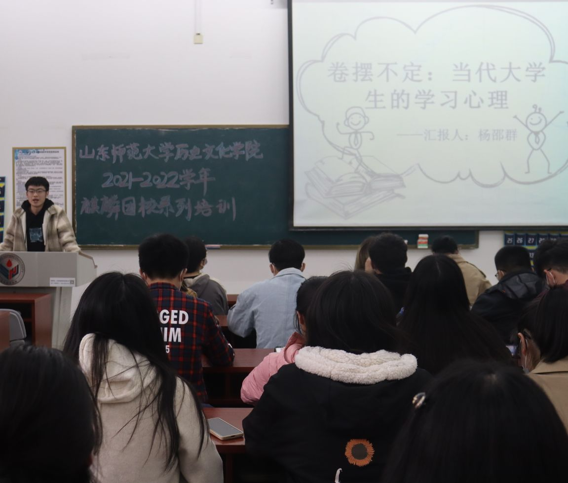 为进一步加强团学干部队伍建设,增强团学干部的整体素质及工作能力,同时发挥榜样作用,传承良好学风,3月23日下午,历史文化学院于长清湖校区崇德楼114教室举办第三期麒麟团校培训活动。本次培训活动由2018级王曦和2020级杨邵群担任主讲人,2020级、2021级班委以及部分研究生参加。