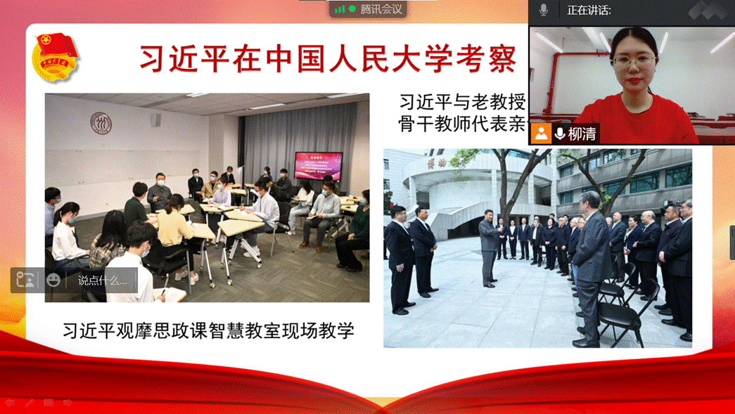 柳清宣讲的主题是“在青春的赛道上跑出最好的成绩”,她从共青团名称的变迁、发展的特殊时期、历届代表会议和团中央走出的国家领导人等四个方面向同学们依次阐述了中国共青团百年来在青春的赛道上取得的辉煌成绩。