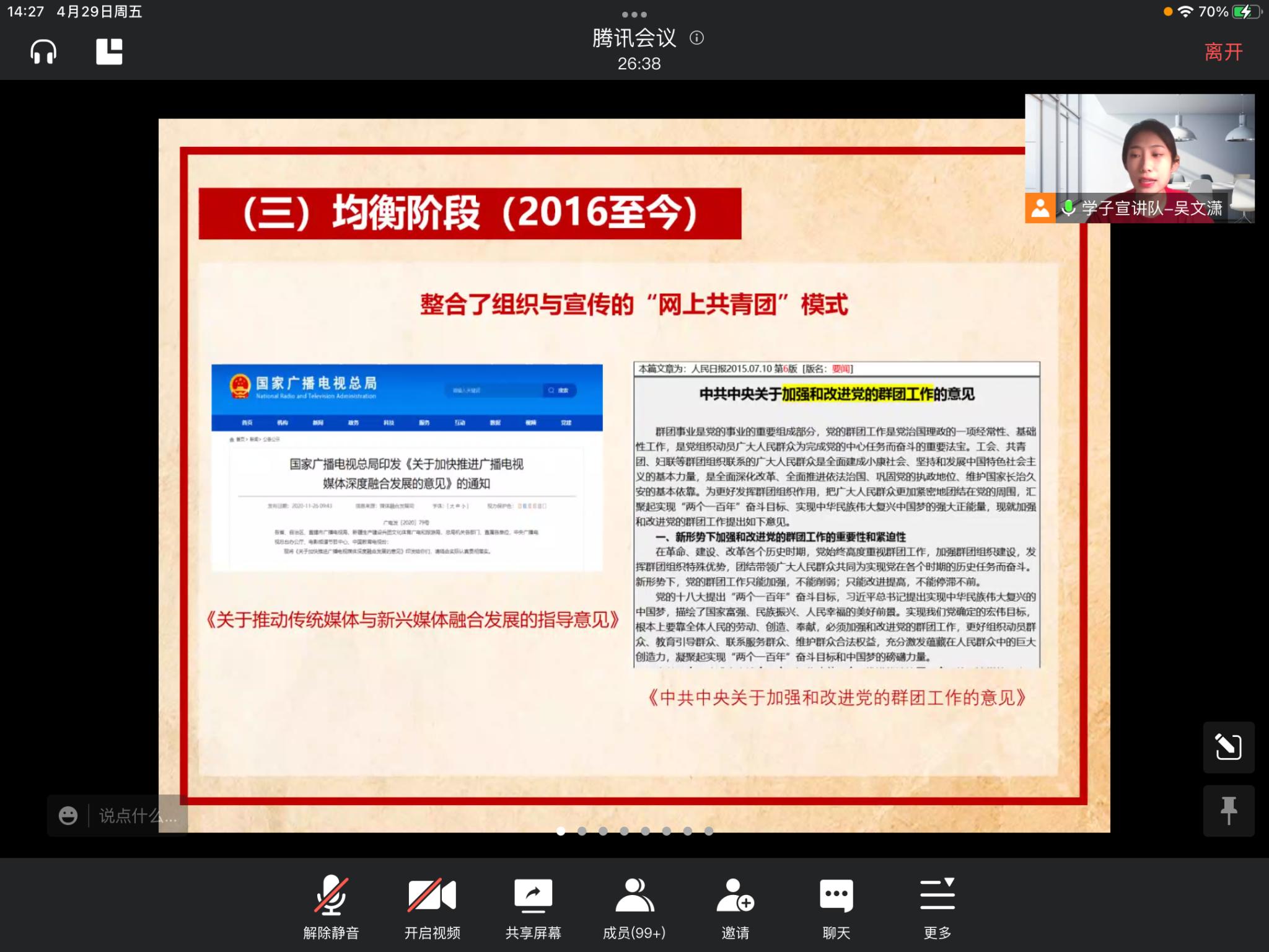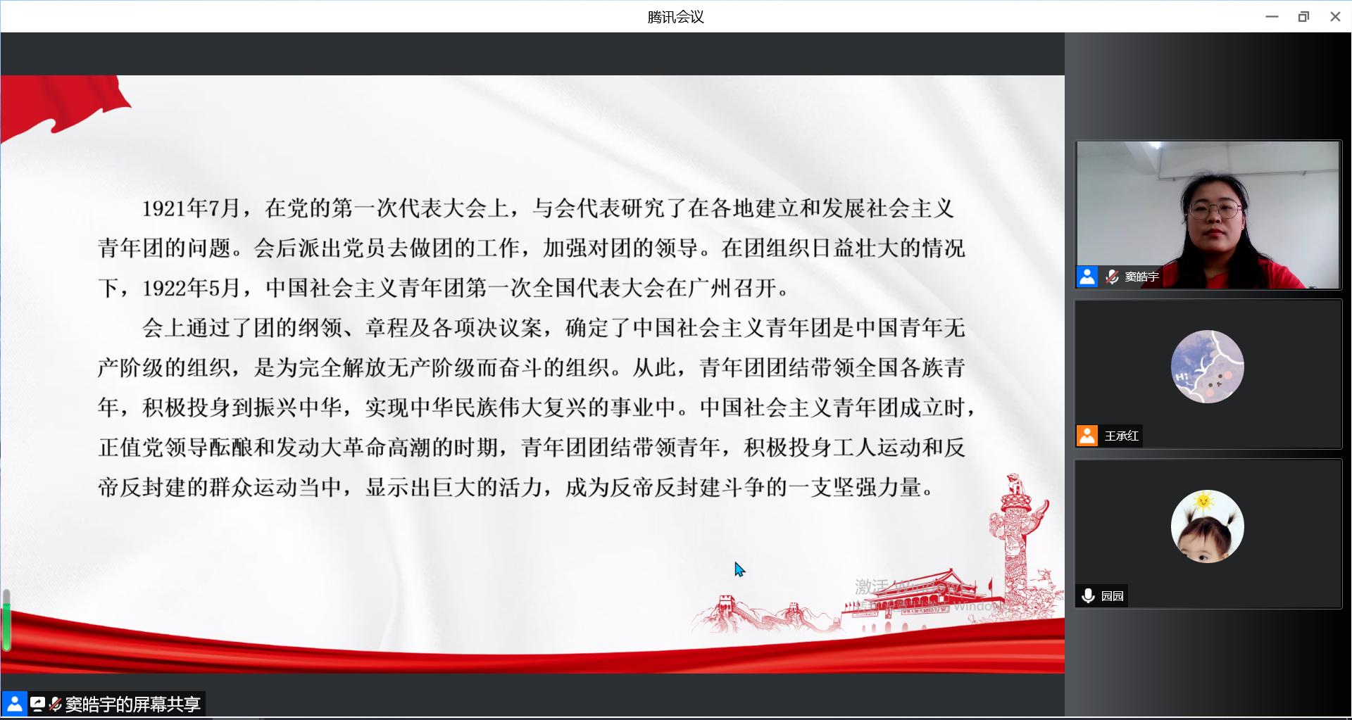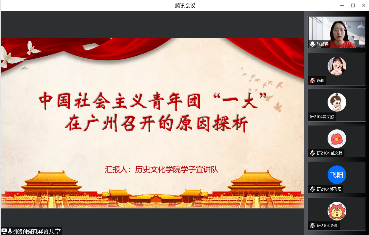 为庆祝中国共产主义青年团成立100周年,切实做好青年团员的团史学习教育,历史文化学院学子宣讲队研究生成员张舒畅、窦皓宇、吴文潇以及崔佳雯于4月29日通过线上会议的形式面向生命科学学院21个研究生团支部共计600余人开展了4场团史宣讲。学院团委委员、研究生辅导员林淑玉老师参与指导,宣讲受到生命科学学院团委的大力支持,研究生辅导员李娜老师全程参与了宣讲。