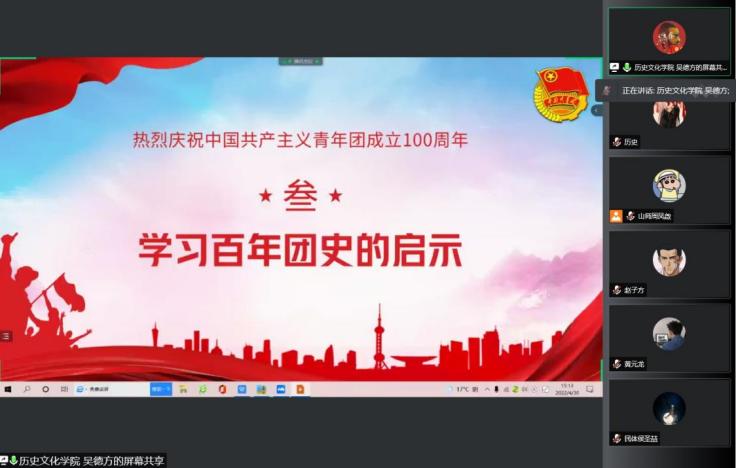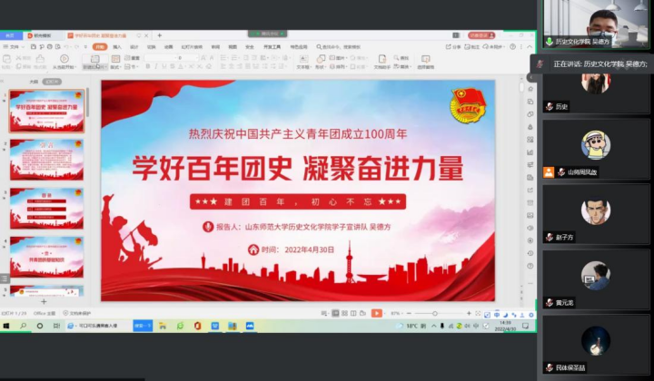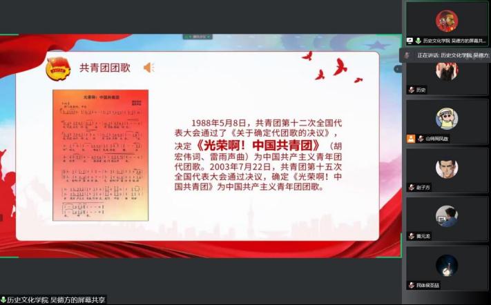 为庆祝中国共产主义青年团成立100周年,历史文化学院学子宣讲队2019级成员吴德方、吴晗余于4月30日走进体育学院2020级7个团支部开展了以“学好百年团史,凝聚奋进力量”为主题的团史宣讲。学院团委委员、2019级辅导员刘畅老师全程指导,体育学院2020级200余名共青团员参加了此次宣讲活动。