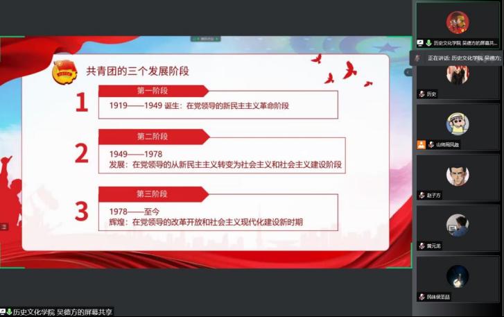 随后,吴德方就共青团的发展历程与始终走在时代前列的先进性进行了基于史料的解读。他按照时间顺序串联起了共青团历史的三大发展阶段,并通过讲述五四运动、“一二•九”抗日救亡运动等重大活动中青年的突出表现,展现了广大中国青年无私无畏的爱国情怀和坚定不移的理想信念。