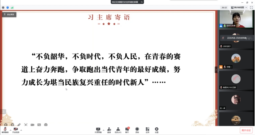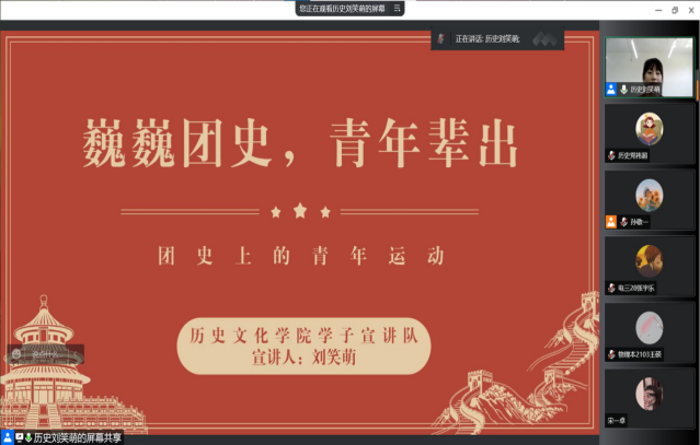在五四青年节到来之际,历史文化学院积极开展五四文化活动。5月3日,我院学子宣讲队成员刘笑萌、党祎超、李宁走进物理与电子科学学院共20个团支部开展以“团史上的青年运动”为主题的线上团史宣讲,本期团校的青年团员参加活动。
