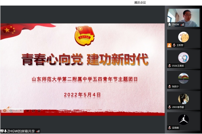 为庆祝中国共产主义青年团成立100周年,切实做好青年团员的的团史学习教育,历史文化学院学子宣讲队2019级成员王权哲于5月4日通过线上视频的形式面向山东师范大学第二附属中学8个团支部开展了以“致敬峥嵘岁月,献礼建团百年”为主题的团史宣讲,适逢五四青年节,此次宣讲受到了二附中团委的大力支持,团委书记魏煜钢老师担当主持人,学院团委委员、学院团委委员刘畅老师参与指导。山东师范大学第二附属中学50余名团员、入团积极分子参加了此次宣讲活动。