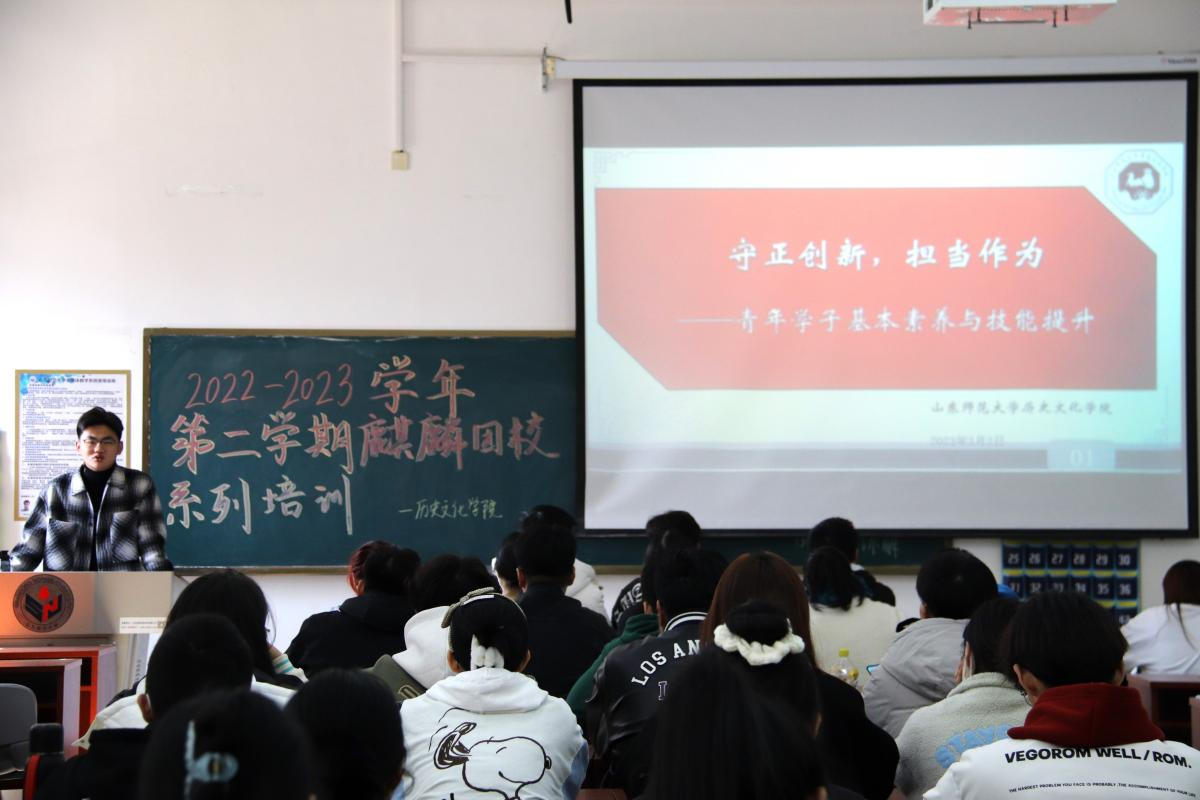 为明确青年学子责任担当,提升学团干部工作能力,历史文化学院麒麟团校在崇德楼114教室举办题为“守正创新,担当作为”培训讲座,由2022届院学生会轮值主席邱纪涵同学担任主讲人,院学生会、青年服务中心及研究生全体学生干部参会。