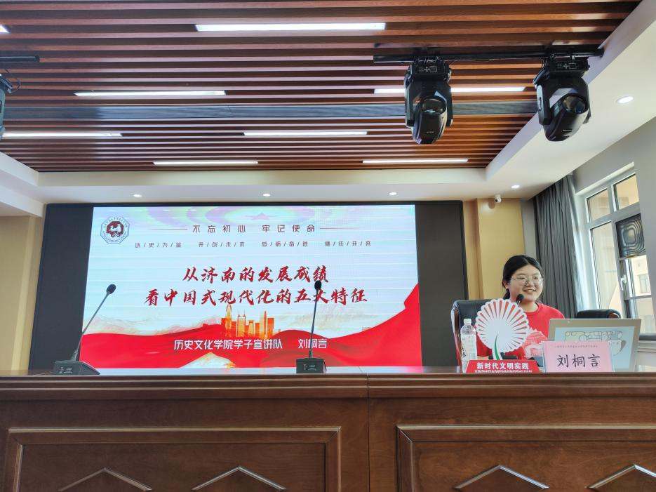宣讲队成员刘桐言为大家讲解了中国式现代化的生成逻辑,并以济南为例阐述了中国式现代化的五大特征,最后带领大家认识了中国式现代化的意义。本次宣讲以济南的发展成就为脉络,并穿插了视频和许多生动的例子,令人印象深刻。