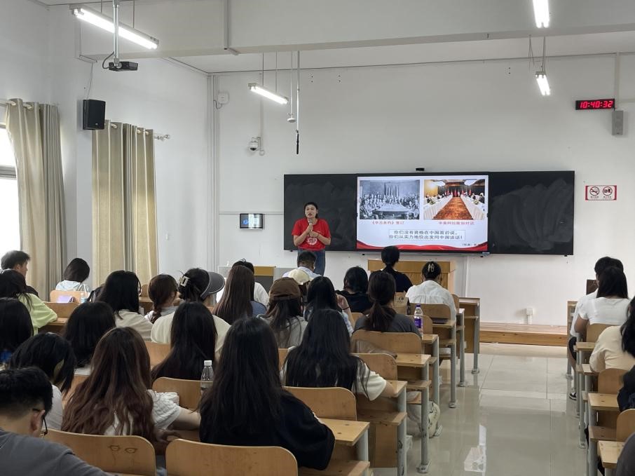 在宣讲伊始,队员陈瑞瑶结合1901年“辛丑条约”签订和2022年阿拉斯加“中美会谈”两大历史事件,分析了中国国际地位的巨大变化。紧接着,她结合当下时事热点和历史典故系统讲述了新中国从“醒过来”到“站起来”再到“富起来”的三大历史性飞跃,展现了中国式现代化的伟大历程,让在场听众加深了对中国式现代化的理解和认识。