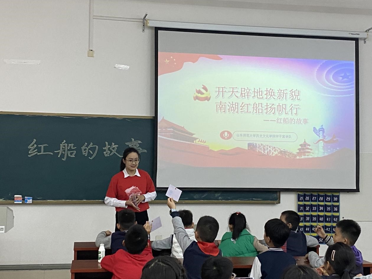 3月16日下午,山东师范大学附属小学二年级的部分学生来到我校长清湖校区开展研学活动。在崇德楼114教室,我院学子宣讲队队员高怡清开展了题为“开天辟地换新貌,南湖红船扬帆行——红船的故事”的宣讲,为小朋友们讲述了一堂有趣、生动的党史课。在场的20余名小朋友、部分老师及家长参与本次活动。
