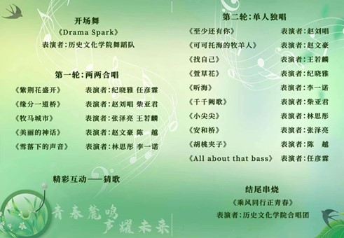 经过全面筹划和精心准备,历史文化学院“青春麓鸣,声耀未来”十佳歌手大赛决赛即将拉开帷幕。大赛海报、节目单、选手风采等资讯新鲜出炉,快来看看吧!