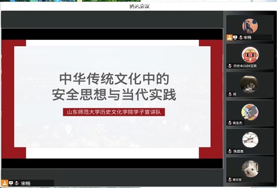 为强化青年安全意识、创新安全普及形式,4月18日,历史文化学院学子宣讲队走进我院2021级6个团支部就“中华传统文化中的安全思想与当代实践”开展线上宣讲,100余名青年团员参与宣讲。