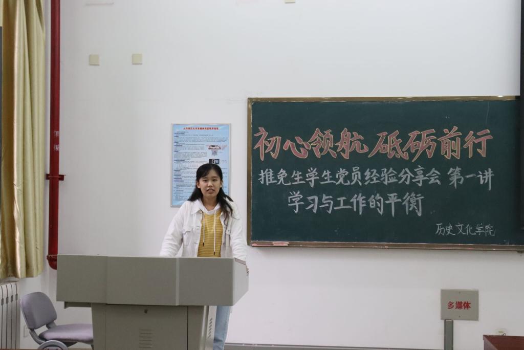 为充分发挥学生党员的先锋模范作用,扎实推进“不忘初心、牢记使命”主题教育开展,历史文化学院学生一支部10月24日下午于长清湖校区崇德楼107教室举办推免学生党员经验分享会。本次分享会以“初心领航,砥砺前行”为主题,邀请2016级学生党员刘书宁为主讲人,各年级学生代表到场聆听。